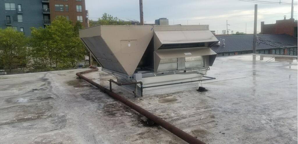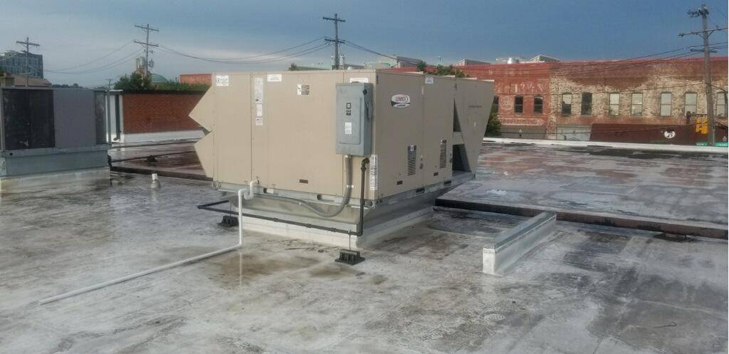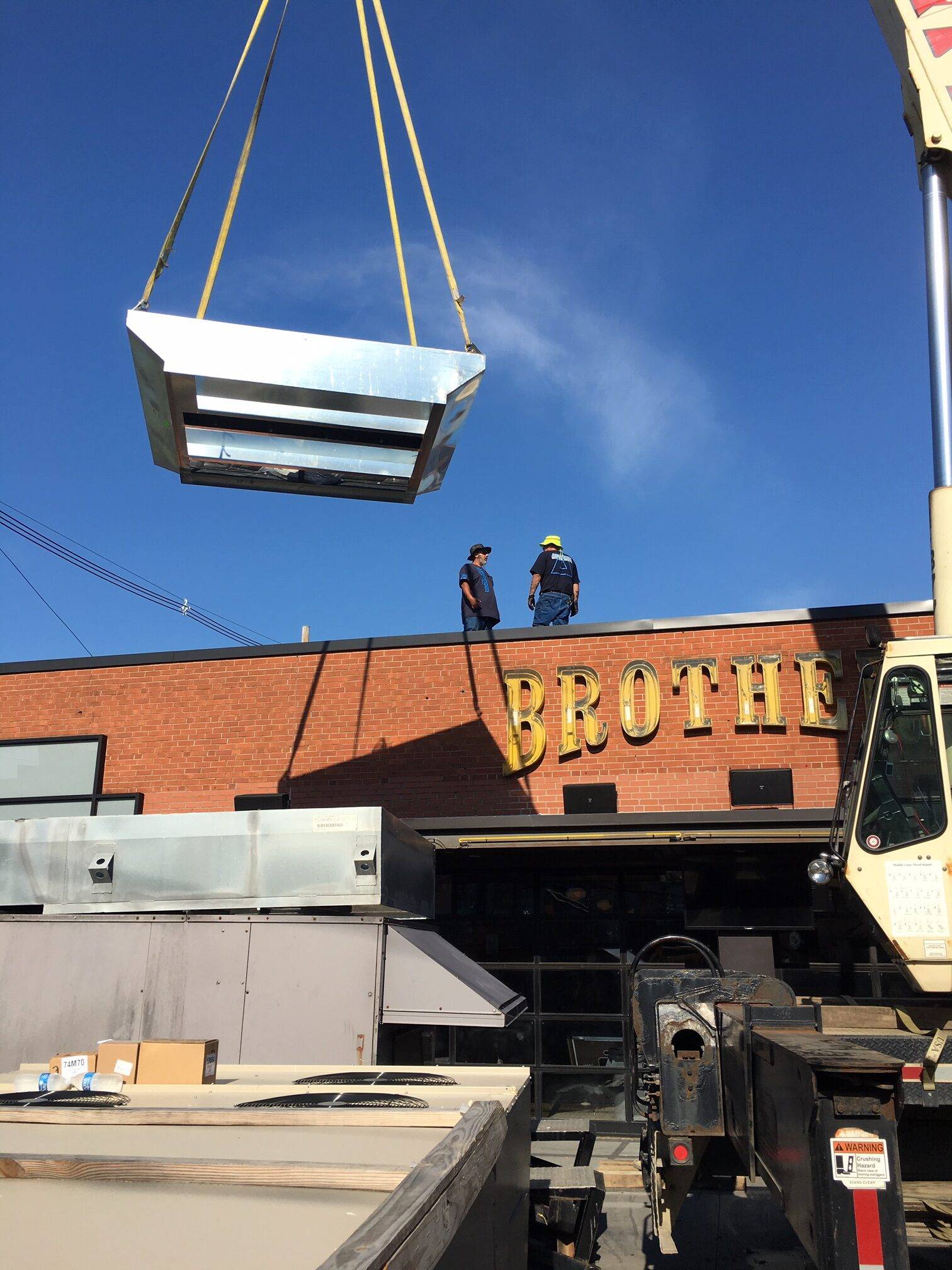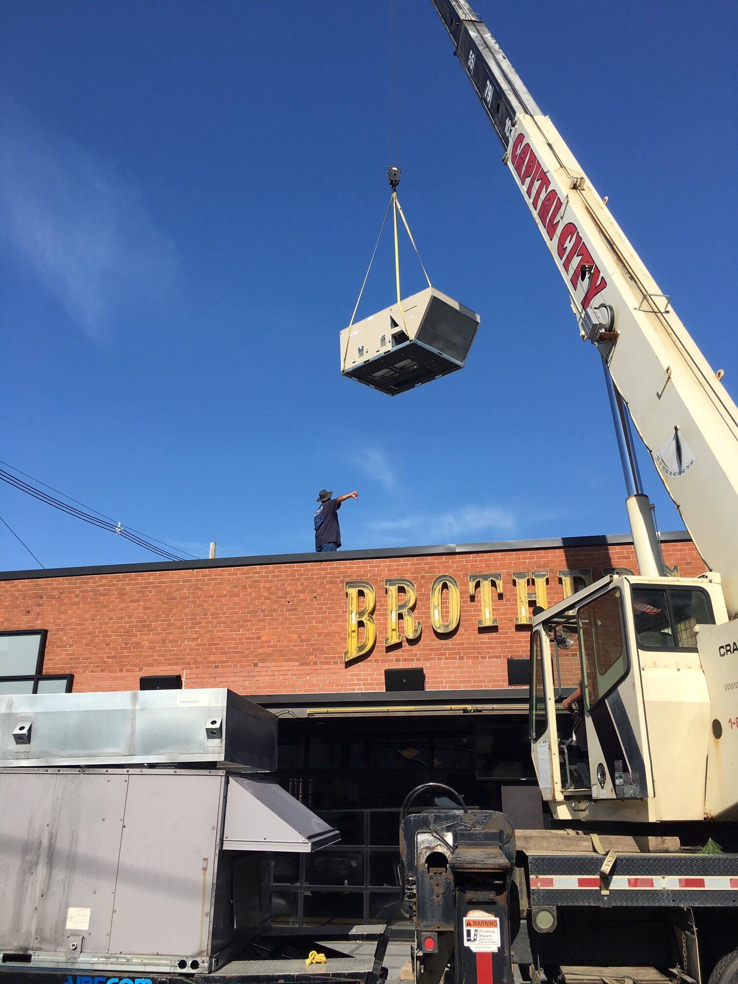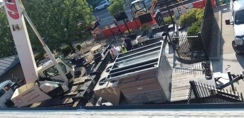 This challenging installation of a 20-ton packaged rooftop unit in downtown Columbus required the removal of tall iron fencing around a patio to allow room for the staging of the installation, equipment and crane. Through thoughtful planning, AireCom was able to prepare the area for a successful and safe crane lift by avoiding any close proximity to overhead power lines. Should your business require replacement of one or more of your commercial heating and cooling units, call AireCom to discuss options that meet your needs.